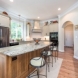 Features include leathered granite countertop, flush-set cabinet doors and drawers, copper sink fixtures and pendant light, and custom trim.