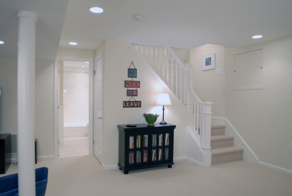 Our clients had several requirements for us to address for their basement renovation project. They wanted to create a versatile and welcoming space to be used universally as a play area for the children as well as a guest area for visitors. This included creating a full bathroom and guest suite and maximizing square footage by adding extra storage space. Unusual constraints or challenges: The biggest challenge of this project was to make the bottom of the basement stairs turn out in both directions. The catch to this seemingly simple task was that the kitchen floor above was preventing this from happening. For this reason, our clients had a very difficult time finding someone who would take on such a challenging project, but we were able to come up with a solution without disturbing the kitchen cabinetry or appliances. Overall results of the project: The clients were thrilled that our company was willing to take on this challenging project and were impressed by the solution and end results of the remodel. The finished basement has continuity throughout the individual rooms and looks elegant and stylish, yet comfortable and functional also as a safe area for children to play in.