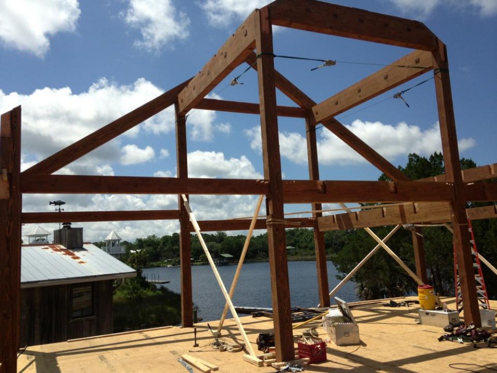 Douglas Fir timbers, handcrafted and raised into place along the water's edge of this Gulf home. A full enclosure system was supplied and installed, including Structural Insulated Panels (SIPs).
