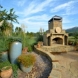 Freeform pool with waterfalls, fire pit, spillover spa, and tanning ledge.