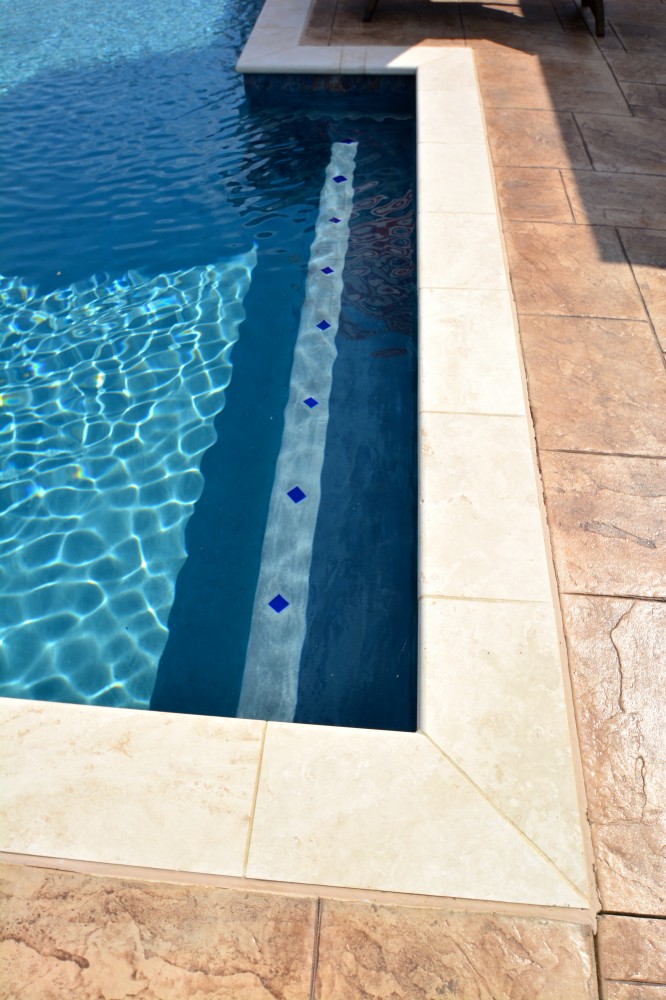 Custom geometric swimming pool with waterfall, spillover spa, and built-in seating and ledges.