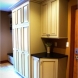 We increased the kitchens functionality by adding counter-top space to the right of the stove. The raised snack bar is perfect for day to day meals and the lowered counter-top was a must for this petite baker. A new lighting plan includes recessed, under-cabinet, and accent lights. Hardwood floors that were toothed in from the dining room, an over-sized hood, beefy turned posts, a prominent apron front sink, glass cabinet fronts, shiny beveled subway tile, and granite counter-tops are key features.