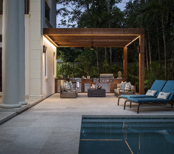 The patio of this recently constructed home in Coconut Grove, FL went from blah to spectacular after Habify designed and installed a luxurious outdoor entertainment space next to the existing swimming pool. Organic elements like the Ipe clad outdoor kitchen and custom built cedar pergola blend harmoniously with the Mediterranean style of the home while enhanced features like integrated LED cove lighting, a built in beverage center and bronze light fixtures elevate the mood and make this backyard the perfect outdoor escape for sunny South Florida.