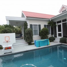 The renovation of the outdoor living spaces added a WOW factor to the transformation that took place at this beach home! Around the refinished pool, the concrete decking was replaced with beautiful IPE wood decking - incorporating nicely with the new stone pool coping and planter border. Along the sides, both porch wings were revamped to include a relaxing bed swing (located off the Master Bedroom porch) and a new grilling space - complete with custom cabinetry, concrete countertops and a spot designed just for the Green Egg! At the end of the pool, the doors to the Cabana were swapped out for mahogany doors and a new workout space was created. Lastly, the screened porch was removed and the interior spaces were extended to meet a full window wall that provides a beautiful view onto the Owner's new oasis!