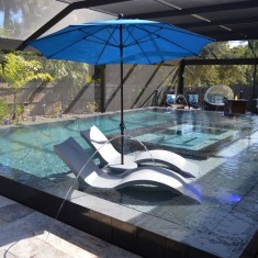 This was a complete overhaul for a pool project. We removed an existing spa, deck and cage and started fresh. The vision for this pool was one of a kind modern elegance with functionality. The pool features a Raised pool with 360 overflow, sun shelf, led blubbers, led deck jets, and spa built within the pool. The deck is Silver Travertine and is accompanied by an open view cage.