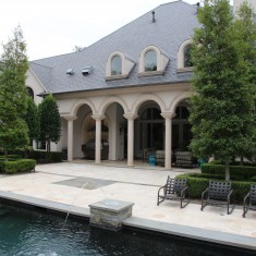 Remodeling an entire backyard, as well as an existing pool is always tricky. You never know for certain how it may have been built or what hiccups you can expect to experience when you begin taking it apart. And when you add the task of completely changing the design aesthetic in the process, the challenge becomes even greater. The original yard reflected that of a southwestern/rustic aesthetic, complete with a freeform rock-lined pool and a slightly dated boulder waterfall. The pool was refinished with Primerastone plaster and accented with a beautiful mosaic waterline tile. We also swapped out flagstone steppers for Lueder limestone coping with a much more modern linear scored, bone colored concrete. We then opted to completely level the waterfall and implement a chic cantilevered wood deck made of Ipe Fiberon on the back side of the pool. We also opted to include a hidden sheer descent waterfall which would pour water straight down into the pool from underneath the cantilevered wood deck. The client also requested a separate kitchen/bar area where the level of shade could be adjusted. To accommodate the request, the designer opted to implement a custom designed/built bar and BBQ which would both be covered by a stand alone shuttered Equinox pergola and outfitted with drop down screens for the sides. The side yard was ripped out and replaced with a basketball court and sitting area. The last remaining piece of the puzzle would be to include a new custom built Lueder topped linear firepit with a generous seating area which happened to fit nicely in between the linear decks and walkways. Re-designing and constructing a total makeover such as this one required a keen eye and an number of talented hands. In the beginning, this client wasn't exactly sure what they wanted, but they did know that their yard needed to be a sleek and modern entertaining space that was very open and inviting for the numerous people that would later pass through the front door and in the back gate. What they ended up with was a very contemporary pool and yard rivaling some of the most modern rooftop lounges being built today, only this space can be found at ground level in the heart of North Texas. All of the decking and walkways make use of perpendicular lines that serve to modernize the look and feel of the space, which was a key element in bringing the yard out of its previous rustic and free-form existence. And while the pool still maintains its original free form shape, the raised wall and the cantilevered wood deck both do a great job of interrupting those curves with bold, straight lines that give the pool a much more modern feel that it had before. To top it off, all of the vertical surfaces in this yard are covered in warm wood tones, mosaic tile and contemporary ledge stone, which all play their own part in modernizing what used to be a rather dated space.