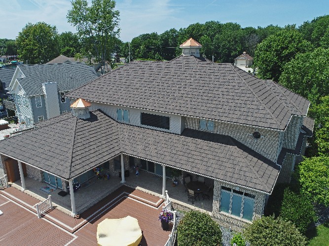 This beautiful, newly built, two-story home was crafted using our aluminum roofing products in unique and creative ways. This home not only features Aluminum Striated Roofing Panels on all of the roof surfaces, but the homeowner also opted to use our Aluminum Oxford Shingles on the outside of the upper story, instead of a traditional vinyl siding. The result is a beautifully protected home that will be enjoyed for a lifetime.