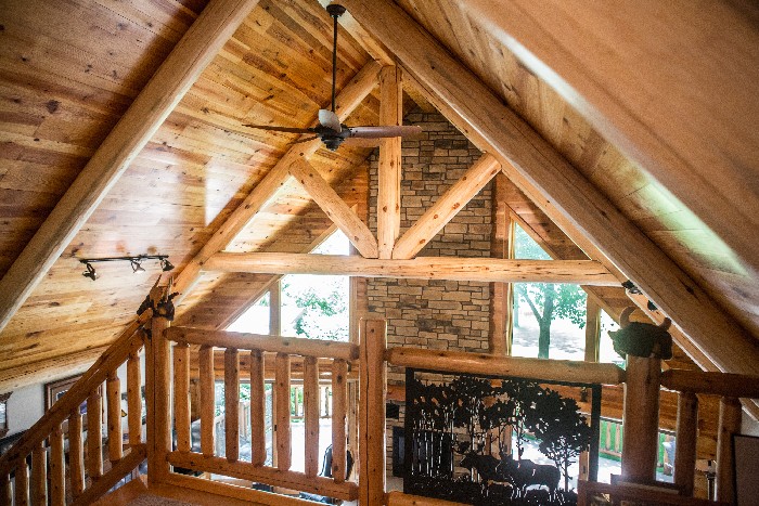 At times, Bill had considered purchasing a vacation home but ultimately decided to make his primary residence the sanctuary he desired. When he first approached us, other areas of his 1980's home had been updated to give the ambiance of a modern rustic lodge. However, his great room still needed to be updated with this design concept. We updated the room's existing fireplace with new brown bricks in varying hues. The original fireplace was extended to the ceiling to give the allure of a chimney. Before commencing work on this project, the ceiling had accent beams that certainly contributed to the room's appeal, but could be improved upon. We replaced these with stunning logs and configured them in a way that gave them the appearance of support beams. Reclaimed southern yellow pine that we pre-finished was also added to the ceiling to promote the allure of a log cabin. The upstairs bathroom was shortened up a few feet to open up the sightline within the loft.