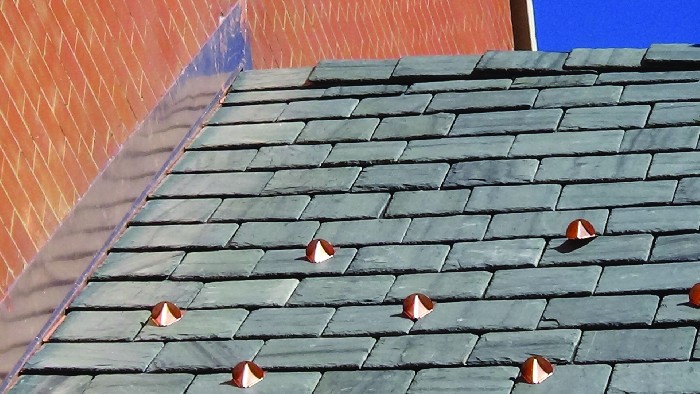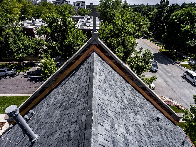 These photos are from a roof replacement on the historic St. John's Garden Association Sanctuary Church at 2401 East 5th Avenue, in Cherry Creek, CO. The roof was replaced with a Natural Vermont Slate tile roof with custom copper flashing, gutters, downspouts, and snow guards. The roof was approximately 3,500 square feet.