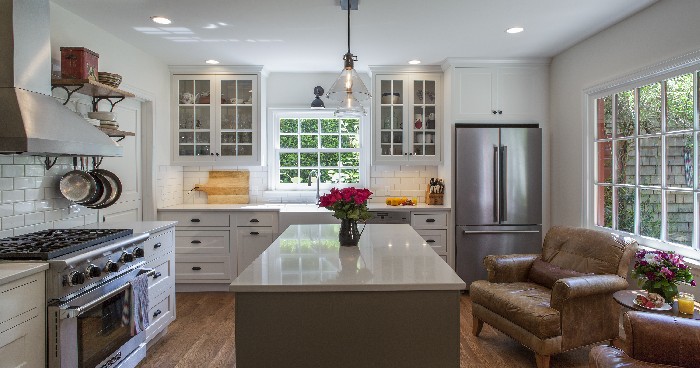 The clients wanted a fresh, all-white kitchen with improved traffic flow, more work space, storage, and natural light, all while better integrating the kitchen into the home and connecting it to the outside. Further, they wanted a modern farmhouse kitchen that better harmonized with their 1938 Colonial Revival home. In a more personalized vein, they wanted more room by the kitchen's large window for their two oversized armchairs, in which they could enjoy the backyard views and wildlife. As with most remodels, the homeowners had budgetary considerations, and we were able to add much-needed space by eliminating an expendable hallway and a defunct chimney to add square footage and introduce more natural light. Where the clients previously contended with competing colors and finishes from the 1960s, they now enjoy a modern farmhouse kitchen with light-reflecting surfaces and a furniture-style island serving as both an anchor and contrasting element.