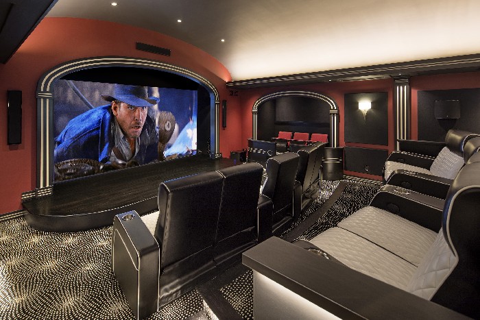The client's goals for this extensive whole house remodel were to upgrade with modern features and add an upscale elegance to this 14,000 sq. ft. French Tudor, originally built in 1977. New features include an expansive kitchen and family room; a grand loggia with alfresco dining, BBQ, and seating areas; and a four-car garage with movie theater/media room on the 2nd story above. Additional luxury amenities include an infinity pool and spa, wine cellar, exercise room, and all new landscape. Coffered ceilings accented by walnut beams in the ceilings of the living room, office, and grand room echo the exterior's Tudor decorative timbering aesthetic. New flooring throughout, including dark French oak and two types of limestone, imported from France-one for interior spaces that flow into exterior spaces and another for exterior patios-add the opulence the owner desired. Elaborate stone masonry work adorns the exterior. The steeply pitched, American slate roof is punctuated by dormer windows.