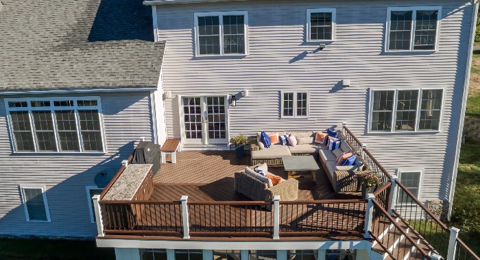 We built this Trex Transcend 18 X 24 masterpiece. The unique Trex Decking diagonal-center layout, Trex outdoor furniture and benches, and finished 3 season room underneath really make this project shine. PBS started with a deck design and customized every detail with the homeowners. Trex Rain Escapes water drainage system, black round metal balusters, and steel framed decking were also strong components of the project. The cascading stairs, riser lights & cap lights make this decking shine at night. The Trex 3 season room is extremely cozy and convenient with fans and outlets. This collaboration with the homeowners was thorough but made sure they got exactly what they wanted. It was our favorite project this year! Trex loved this project so much that they feature it on their website and on the cover of marketing material.