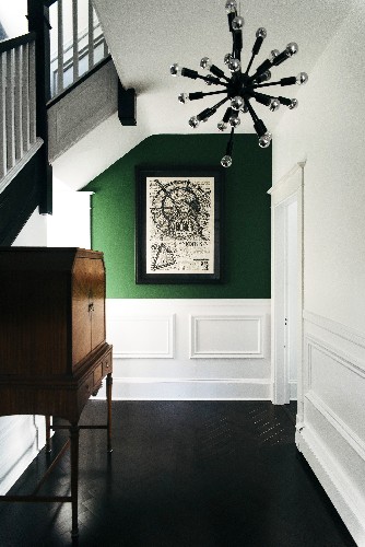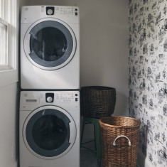 This whole home renovation has a custom hexagon tiled welcome mat. Clean white wainscoting is accented with fresh clover green to add a pop of color to the foyer. The stairway was updated with sleek black rail and wispy black and white wallpaper. The floors throughout the main level are custom silver maple hardwood laid in a show-stopping herringbone pattern. The new kitchen includes a full pantry wall, open shelves, and contrasting island cabinets. White marble countertops, simple white subway tiles, and Carrara marble hexagon floor tiles add texture and elegance to the space. The dining room was opened up and given built-in storage. The new laundry space has unique "Brooklyn Toile" wallpaper which appears to be traditional French Country Toile but includes scenes of subways.
