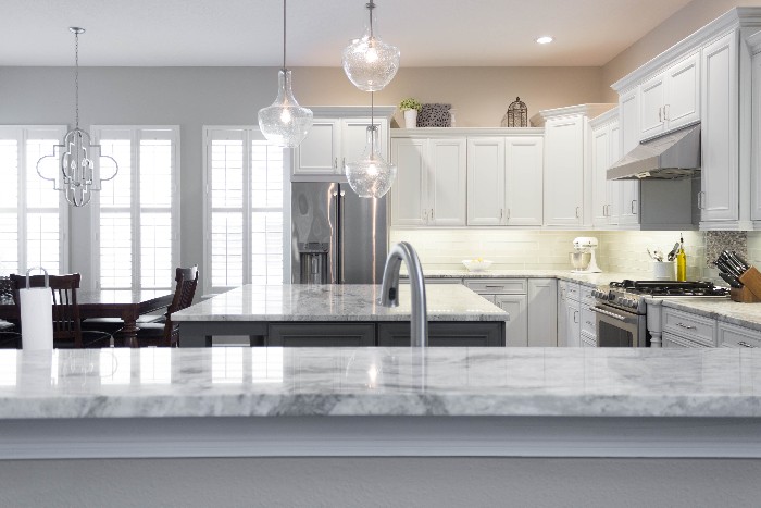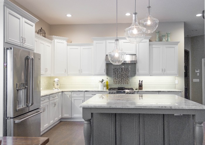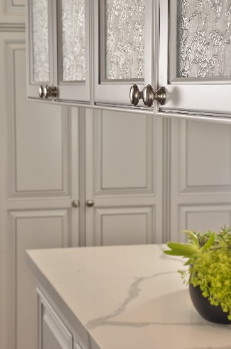 When the clients decided to renovate their dated kitchen, they wanted an enjoyable, casual dining space for their friends and family, with plenty of additional storage. While they were not interested in changing the existing layout, they were interested in updating the style of kitchen, making it light and bright. Gayler achieved this with a transitional design that seamlessly blended both traditional and contemporary elements. Upper cabinets were installed above the center island along with dual sided cabinet doors and Delta Frost textured glass. This created a beautiful focal point in the kitchen on either side of the island, and created a more open feel. The overlay cabinets were painted in a striking white with gray glazing. The upgraded built-in pantry was designed to maximize storage. Beautiful, maintenance free Quartz countertops were installed. In addition, the quartz was placed on the back wall behind the stainless steel Zephyr hood.