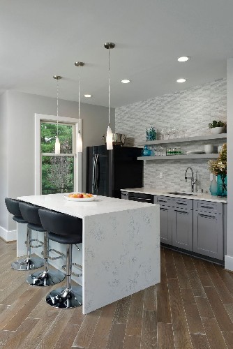 This beautiful, open floorplan kitchen remodel includes gorgeous Cambria Quartz, waterfall counter tops (which we paired with Executive Cabinetry), and all-wood cabinets. We chose a Sampsonville door style which is sleek and simple. The main kitchen cabinets are Alabaster in color and the island is Amaretto in color to add an accent color and two-toned element to the design. Topped off with stainless steel appliances, Amerock hardware pulls in brushed nickel and an accented glass back-splash from Glazzio Tiles. This kitchen is perfect for entertaining family for the holidays or mingling with friends. We loved seeing the client's face after seeing the completed project. This is yet another kitchen remodel we are proud to show off. No job is too big or small for the Beattie Dev. team! We strive to make lasting relationships and raving fans!