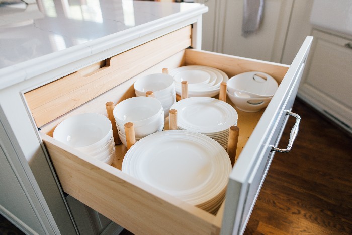 The perimeter cabinets are original, and we replaced the floor and built a new island with new cabinets that closely match the existing. All of the cabinets were then restained to match and look like they had always been there together. The second photo show the storage features of the new island like a trashcan, spice pull-out, double tiered silverware tray, and pull-out shelves.