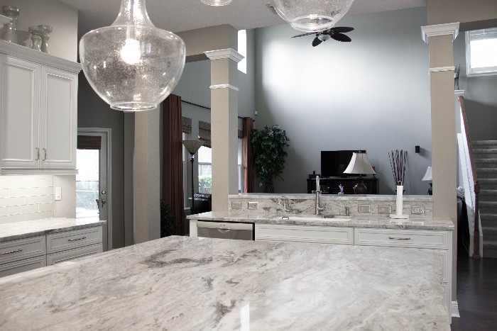 1) Overcoming a dark secluded kitchen by opening the space to 2 family gathering areas, adding natural light,