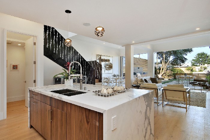 The project features an entire home remodel, with the kitchen as the heart of the home. The client's main interest was to invest in a property that was in a dire situation, with the intent of reintroducing the property to the community in a brand new, current and relatable point of view, while featuring aspects of modern design. The main goal was to create an open and inviting atmosphere by implementing an open floor plan, free-flowing but cohesive spaces, and a California vibe. In order to bring the outdoors into the home, the kitchen was positioned towards the back of the property and flowed into the living area, which opened up to a beautiful urban backyard patio. A mixed use of materials such as Walnut, glass tile and marble throughout the home elevated the space and reinforced the concept of light, reflection and space. The kitchen also boasts the latest flush inset appliances, deep drawers, storage solutions, and a waterfall island as a gorgeous focal point.