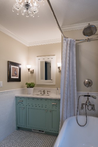 This master suite was transformed from a cluttered, inefficient space, into a cohesive area with intuitive flow and a clean, cozy aesthetic. The enlarged bathroom required relocating plumbing to include a new amply-sized shower with built-in bench. New storage solutions were created throughout, and a little-used hallway became a private sitting room. Character-rich design elements and abundant lighting gave our clients the warm, well-organized living space they envisioned.