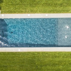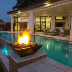 With constraints in every direction, this beautiful contemporary design was developed with entertaining in mind. What was once thought of as a lost cause of a skinny backyard with over 4 inches of elevation change was uniquely transformed into six entertaining spaces, which include an artificial turf lawn, 2 tanning areas, a fire pit, and a dining and bar space. The Equinox structure which transforms from a shade arbor to a fully covered roof with the click of a button adds a perfect complement to the water & fire. Previous designers had told the homeowners that the pool needed to be in the side yard which was unacceptable as they wanted to see the space out of their back windows. The final product was exactly what the owners had envisioned for their dream backyard.