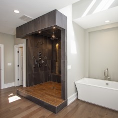 We love this master bathroom remodel with its HUGE spa shower. It includes a no curb, custom shower pan with a step flooring system. This is what a $50,000 shower looks like. The shower features black textured tile accented with glass. There are 11 Moen heads with 4 body sprays per side, rain heads with LED and recess can lighting, a 6' bench, 3 glass shelves, a Basco shower door, a vanity by Schrock with quartz white tops. In addition, it features beautiful, rectangular, white, deep well sinks with Moen faucets. The mirrors are custom made by a local shop. The three tall towers have interior electric stations for all bathroom essentials, and polished chrome hardware to finish the look. The floors are Shaw Industry hand scraped Hickory. Finally, there is a custom 3 piece 10" baseboard and 2 pieces of 4 1/2" casings, a heated towel rack, and a monster soaking tub with floor mounted tub filler. The bathroom cost is $89.