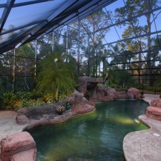 Simply elegant oasis in tranquil rural setting! The pool itself is 1,400 square feet, nearly 40,000 gallons and is heated by both gas and electric. Included are four bar stools and an elevated bar, spacious sun shelf for lounging or letting the kids play, absolutely stunning star floor lighting throughout, four laminar water features, two lighted bubblers and an 8 x 8 heated spa with 10 jets make this private retreat feel like a resort minus all of the noise. It also includes an in-floor cleaning / circulation system and intelli chem chemical controller which makes maintenance a breeze. To top it off everything is fully automated and can be controlled with a smart phone or tablet. The pool is complimented by a HUGE vein cut travertine deck area and covered lanai complete with a summer kitchen that a chef could dream about. Motorized screen inserts allow the lanai to be open or enclosed at the touch of a button, making the entire area both stunning and perfect for entertaining.