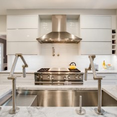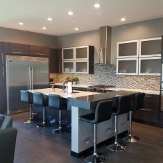 3) Strategically placing a multitude of stainless appliances within the aesthetic of the kitchen, adding clean line cabinets and durable counter-tops to work with everyday living and entertaining,