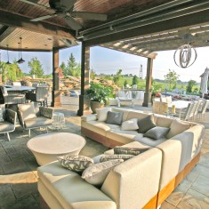 This client lived on a beautiful ranch. They had an existing stone and wood trellis outdoor kitchen that they wanted to expand upon and a kidney-shaped pool that they wanted to be replaced. Their wishlist included shaded areas that would not block the first story windows, a place to gather/entertain, cooking stations, and a pool that would not interfere with the view of the pond. This final outcome is a two-story porch with a low covered area, a two-sided fireplace, one side for seating/gathering the other for cooking, a restaurant grill insert, and a whole hog pit. We were able to create a true backyard retreat.