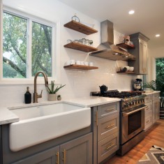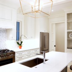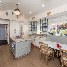 The challenge we faced was making the kitchen feel and look elegant while keeping the farm and rustic ambience; also we were faced with having to make the ceiling a paneled vaulted ceiling to match the living room area. An added touch was the gold fixtures and cabinet pulls. The intent was to keep the kitchen open and communal while maintaining the charm which the rest of the house is imbued with.