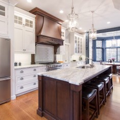 This renovation was in a historic home that in another life had been a ballroom for a grand estate in Philadelphia. The design objectives included retaining the character of the home through the use of larger scaled cabinets and using those details to transition seamlessly from the ballroom into the kitchen. One of the challenges involved was merging two rooms into the grand kitchen space that you see. Strong architectural detail through the use of columns, panels, and a three-part crown molding also helped the kitchen relate to the home's grand past. Our team needed to have careful attention to detail throughout the design and construction stages in order to retain the authenticity and integrity of this historic home.