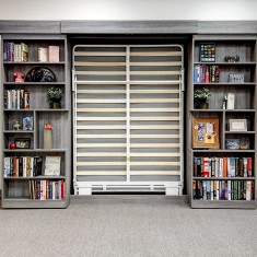 An empty wall in a study is transformed into a guest room with this completely customized design of a sliding bookcase Murphy Bed. A beautiful rustic woodgrain material is used to construct this elegant and functional wall unit. Contemporary styling and color palette with customized crown molding resulted in a stunning project.